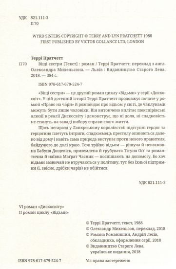 «Віщі сестри» — це другий роман підциклу «Відьми» у серії «Дискосвіт». У цій дотепній історії Террі Пратчетт продовжує почате у романі «Право на чари» й розповідає про відьом у світі, де чаклунами можуть бути лише чоловіки. Він витончено вплітає шекспірівські алюзії в реалії Дискосвіту і демонструє, що ні доля, ні спадковість не стануть на заваді вибору справи свого життя.