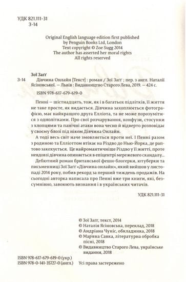 Пенні — шістнадцять, тож, як і в багатьох підлітків, її життя не таке просте, як видається. Дівчина захоплюється фотографією, має найкращого друга Елліота, та не може порозумітися з однолітками. Про свої розчарування, конфузи, стосунки з хлопцями та панічні атаки вона чесно й відверто розповідає у своєму блозі під ніком Дівчина Онлайн. А тоді весь світ наче змовляється проти неї. І Пенні разом з родиною та Елліоттом втікає на Різдво до Нью-Йорка, де раптово закохується. Це найромантичніше Різдво у її житті, проте невдовзі дівчина опиняється в епіцентрі мережевого скандалу... Дебютний роман британської фешн-блогерки, ютуберки та письменниці Зої Заґґ «Дівчина онлайн», який вийшов у листопаді 2014 року, побив рекорд за перший тиждень продажів. На сьогодні авторка написала про Пенні вже три книги, які, безсумнівно, завоюють визнання і в українських читачів.
