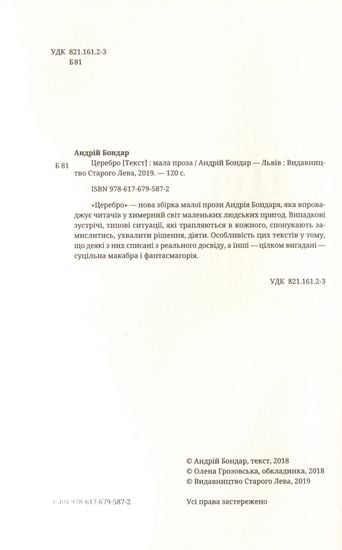 «Церебро» — нова збірка малої прози Андрія Бондаря, яка впроваджує читачів у химерний світ маленьких людських пригод. Випадкові зустрічі, типові ситуації, які трапляються в кожного, спонукають замислитись, ухвалити рішення, діяти. Особливість цих текстів у тому, що деякі з них списані з реального досвіду, а інші — цілком вигадані — суцільна макабра і фантасмагорія.