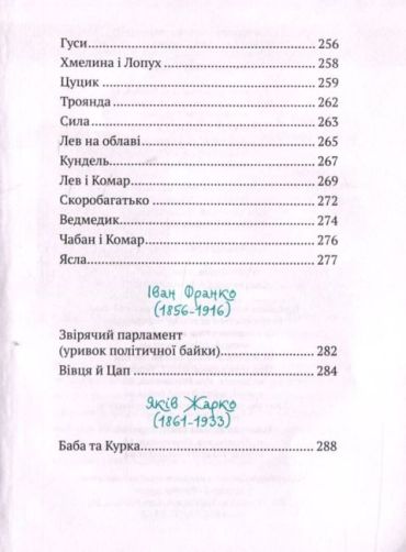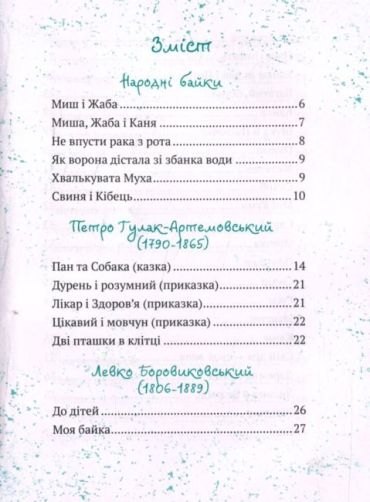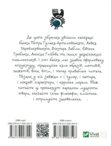 У цей збірник увійшли кращі байки Петра Гулака-Артемовського, Левка Боровиковського, Віктора Забили, Євгена Гребінки, Леоніда Глібова та інших українських письменників. І хоча байка має здавна сформовану структуру, традиційне коло образів, мотивів, сюжетів, вона, втім, і тепер приваблює читача. Так як в ній завжди є і гумор, і сатира, і яскраві характери, і корисна мораль. Тому читайте ці просочені народною мудрістю твори, осягати їх філософію, смійтеся і отримуйте задоволення.