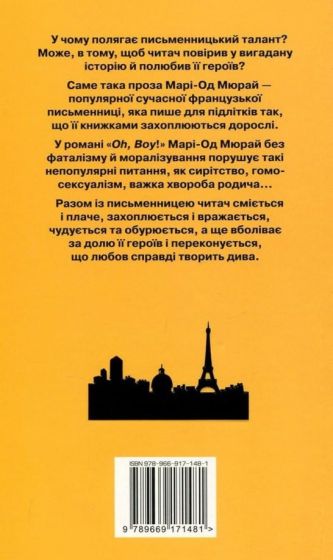 Марі-Од Мюрай — знаменита французька письменниця, яка пише для юнацтва. У романі «Oh, Boy!» авторка напрочуд талановито, з гумором і без моралізування розповідає історію трьох сиріт: чотирнадцяти, восьми і п’яти років. Читач, співчуваючи цим непересічним і талановитим дітям, переосмислює такі непрості й болючі теми, як сирітство, гомосексуалізм, тяжка хвороба рідної людини, відповідальність за свої вчинки. Читайте роман «Oh, Boy!» — це справжня легка французька проза, яка збагачує розум і розвиває душу!