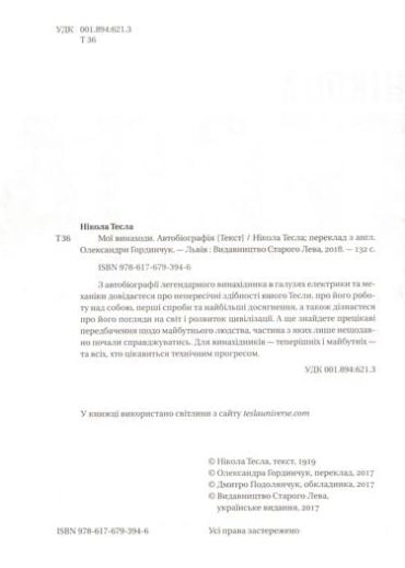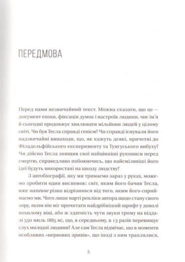 З автобіографії легендарного винахідника в галузях електрики та механіки довідаєтеся про непересічні здібності юного Теслі, про його роботу над собою, перші спроби та найбільші досягнення, а також дізнаєтеся про його погляди на світ і розвиток цивілізації. А ще знайдете прецікаві передбачення щодо майбутнього людства, частина з яких лише нещодавно почали справджуватись. Для винахідників — теперішніх і майбутніх — та всіх, хто цікавиться технічним прогресом.