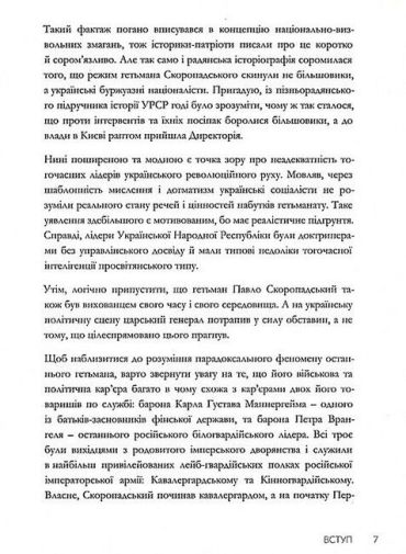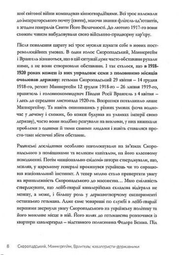 Автор цієї книжки намагається зрозуміти суперечливу постать гетьмана Павла Скоропадського, порівнюючи його не з тогочасними українськими політиками, а з товаришами по службі: Карлом Густавом Маннергеймом і Петром Врангелем.