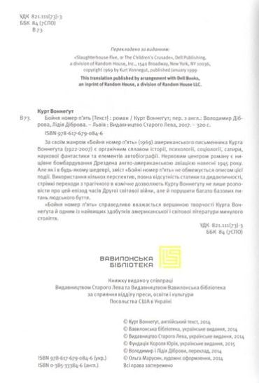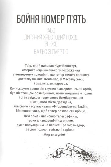 За своїм жанром «Бійня номер п'ять» (1969) американського письменника Курта Воннеґута (1922-2007) є органічним сплавом історії, психології, соціології, сатири, наукової фантастики та елементів автобіографії. Нервовим центром роману є нищівне бомбардування Дрездена англо-американською авіацією навесні 1945 року. Але як і в будь-якому шедеврі, зміст «Бойні номер п'ять» не обмежується описом цієї новини. Використання кількох перспектив, повна відсутність статики та дидактичності, стрімкі переходи з трагічного в комічне дозволяють Курту Воннеґуту не лише розповісти про цей епізод часів Другої світової війни, але й порушити багато базових питань людського буття. «Бійня номер п'ять» справедливо вважається вершиною творчості Курта Воннеґута й одним із найвищих здобутків американської і світової літератури минулого століття.