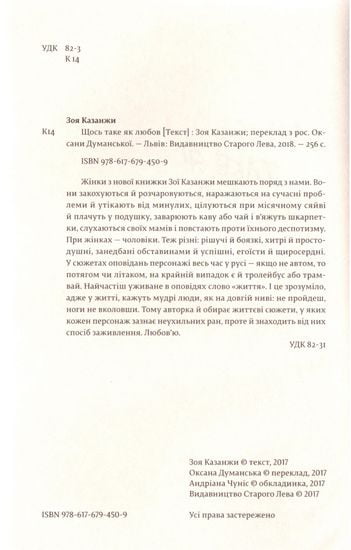Жінки з нової книжки Зої Казанжи мешкають поряд з нами. Вони закохуються й розчаровуються, наражаються на сучасні проблеми й утікають від минулих, цілуються при місячному сяйві й плачуть у подушку, заварюють каву або чай і в'їхав яжуть шкарпетки, слухаються своїх мамів і повстають проти їхнього деспотизму. При жінках — чоловіки. Теж різні: рішучі й боязкі, хитрі й простодушні, занедбані обставинами й успішні, егоїсти й щиросердні. У сюжетах оповідань персонажі весь час у русі — якщо не автом, то потягом чи літаком, на крайній випадок є й тролейбус або трамвай. Найчастіш уживане в оповідях слово «життя». І це зрозуміло, адже у житті, кажуть мудрі люди, як на довгій ниві: не пройдеш, ноги не вколовши. Тому авторка й обирає життєві сюжети, у яких кожен персонаж зазнає неухильних ран, проте й знаходить від них спосіб заживлення. Любов'ю.