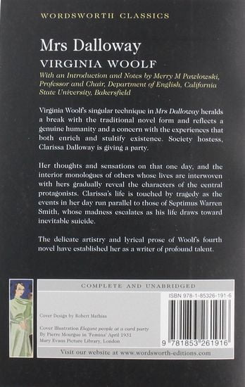 Society hostess, Clarissa Dalloway is giving a party. Her thoughts and sensations on that one day, and the interior monologues of others whose lives are interwoven with hers gradually reveal the characters of the central protagonists. Clarissa's life is touched by tragedy as the events in her day run parallel to those of Septimus Warren Smith, whose madness escalates as his life draws toward inevitable suicide.