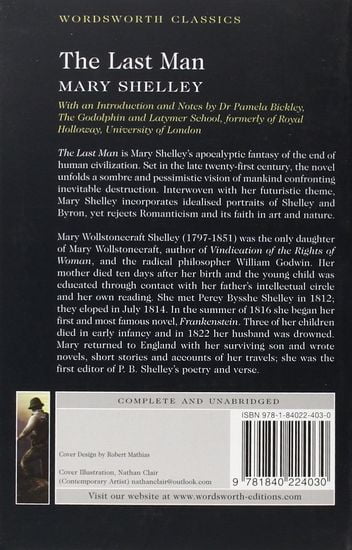 The Last Man is Mary Shelley's apocalyptic fantasy of the end of human civilisation. Set in the late twenty-first century, the novel unfolds a sombre and pessimistic vision of mankind confronting inevitable destruction. Interwoven with her futuristic theme, Mary Shelley incorporates idealised portraits of Shelley and Byron, yet rejects Romanticism and its faith in art and nature.