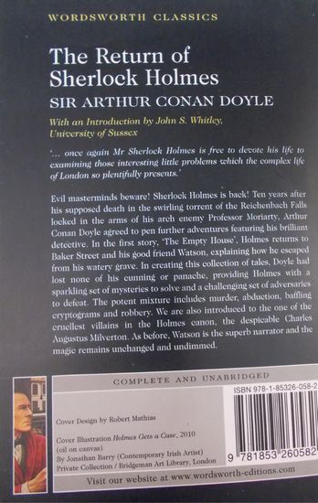 Evil masterminds beware! Sherlock Holmes is back! Ten years after his supposed death in the swirling torrent of the Reichenbach Falls locked in the arms of his arch enemy Professor Moriarty, Arthur Conan Doyle agreed to pen further adventures featuring his brilliant detective. In the first story, 'The Empty House', Holmes returns to Baker Street and his good friend Watson, explaining how he escaped from his водянисті grave.