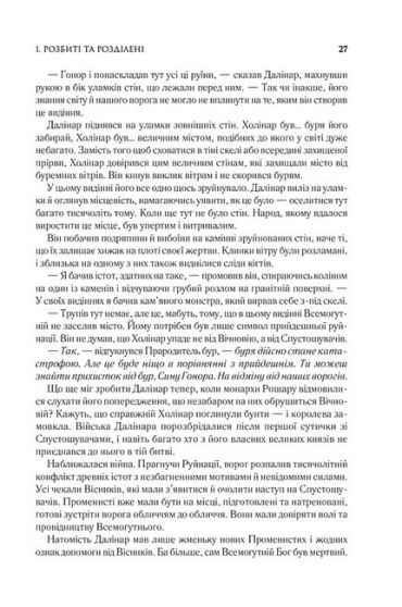 У місті-вежі Урітіру, високо над бурями, Шаллан Давар досліджує чудеса стародавньої твердині лицарів Променистого ордену. Та схоже, що навіть їхнє відновлення вже не зупинить кінця цивілізації…