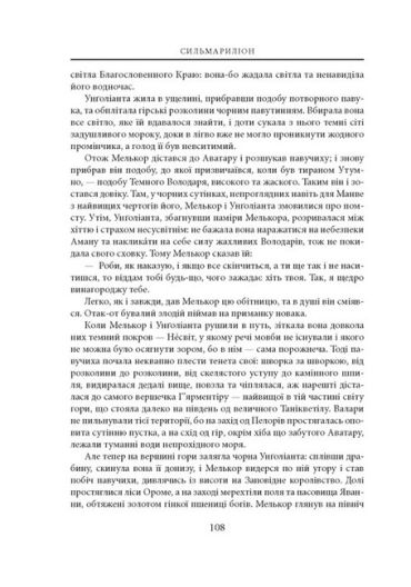 Ця книга — предтеча Володаря Перснів, але водночас і самодостатній та цілісний легендаріум. Майстерно продуману міфологічну історію вигаданого, але напрочуд реалістичного Середзем’я зібрав під однією обкладинкою син Автора — Крістофер Толкін. Читач тримає в руках не просто компіляцію, а справжній епічний звід про боротьбу між добром і злом, описану в окремих творах. Айнуліндале — міф про Сотворення Світу, про виникнення Зла та причини Падіння; Валаквента — опис ієрархії божественних сил, їхньої вдачі та ролі у Сотворенні; Квента Сильмариліон — історія Сильмарилів: від їх створення, повстання Феанора та його роду проти богів, вигнання бунтарів з Валінору та їхнього повернення до Середзем’я — аж до безнадійної, попри жертовну мужність, війни з великим Ворогом за ці досконалі коштовності; Акалабeт розповідає про падіння великого острівного королівства Нуменор наприкінці Другої епохи, а розповідь Про Персні Влади подає короткий огляд величних подій Третьої епохи, насамперед — перебіг Війни за Перстень.