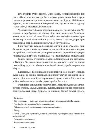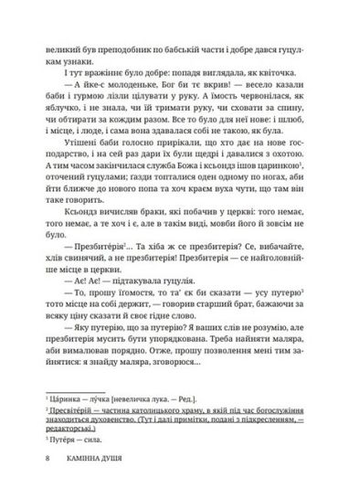 Перше видання повісті Гната Хоткевича «Камінна душя» було опубліковане 1911 року. Саме за ним здійснене видання цієї книжки. Звісно, у нашій редакції максимально збережено особливості гуцульського діалекту, а також ми повертаємо чимало фрагментів тексту, які були вилучені у радянських виданнях.