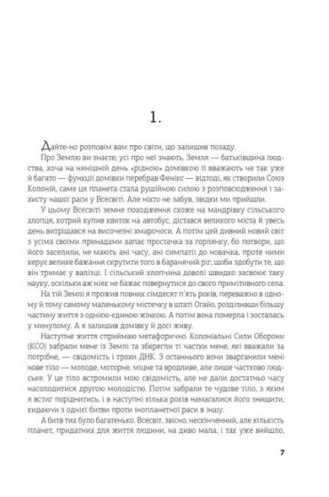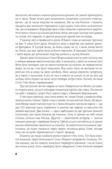 У такому світі я провів шість років. Я бився і ледь не загинув, причому не раз. У мене були друзі, більшість яких я втратив, але деяких удалося врятувати. Я зустрів жінку, до болю схожу на ту, з якою я ділив життя на Землі, але яка, проте, була осібною персоною. Я захищав Союз Колоній і свято вірив, що допомагаю людству вижити у цьому Всесвіті.