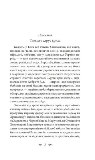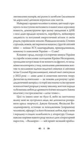 Вірне кохання і цинічна зрада, славетні тріумфи та болючі поразки — історія України з давніх часів і донині вражає свідченнями про велич сильних духом непересічних особистостей та ганебну деградацію людців. Родова пам’ять зберігає унікальні коди-символи, в яких зашифровані «ключі» ментальності нашого народу — потужний потенціал для остаточної перемоги сил добра над підступним злом. У детективний сюжет вплетені епізоди війни, що з 2014 року триває в Україні, відгомін минулих боїв, що відбувалися на полях битв і в душах тих, кого черконули своїми «крилами» міфічні чи цілком реальні валькірії. Вир подій затягує, переформатовуючи людські долі, та остаточний вибір завжди за нами, — стверджують герої львівського детектива із жіночим обличчям.