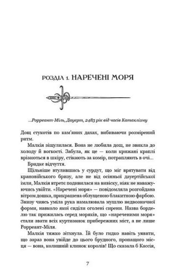 Пасербиця короля, герцогиня-бастард, людина принцеси, клинок королеви — вона має багато прізвиськ, але чи хоч одне з них вірне? Малкія Денмір — герцогиня за правом народження і клинок королеви за посадою. Вона почувається білою вороною у Елмессарському палаці, й лише прихильність принцеси надає сенс її життю і забарвлює його у яскраві кольори. На жаль, трагічні події змушують Малкію покинути палац.