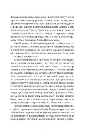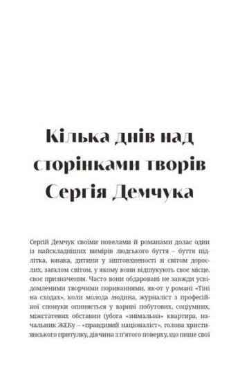 Ця збірка включає ранні оповідання Сергія Демчука. Вони оригінальні тим, що в них персонажі вписані у контекст свого часу, а це двотисячні. Непрості роки для простих мешканців міст і містечок - від підлітків до чоловіків, від дівчаток до жінок, як прийнято було казати, «зі складною долею», бо чого б то вчительці продавати на базарі парфуми?! Бути в когось, належати комусь, відчувати любов безсумнівну і прагнути любові реальної - цим живуть люди, що їдуть електричками, садять і копають картоплю, вчать хлопчаків сміливості чи пресують їх ні за що в міліції. Бо життя у своїй природній плинності і обдаровує, і позбавляє. Але воно - єдине й дорожче за все на світі.