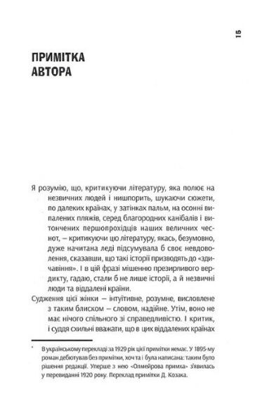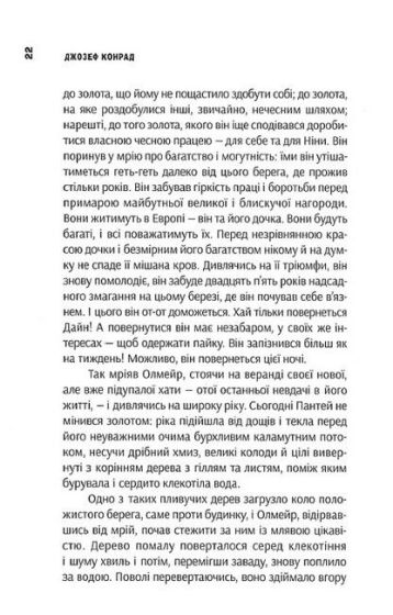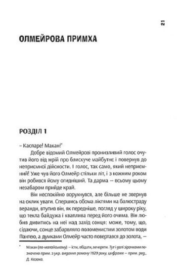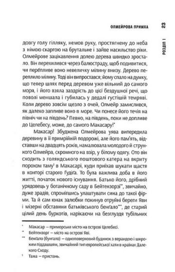 «Олмейрова примха» і «Вигнанець з островів» — перші два романи Джозефа Конрада, які зробили його помітним на лондонській літературній арені, але разом з тим принесли йому осоружну славу «екзотичного письменника». Про ці твори прихильно відгукувався Герберт Веллс, а написання одного з них супроводжувалось любовною історією, слід якої віддалено зберігся лише в епіграфі. Саме в цей період свого життя Конрад остаточно полишає море та, повний сумнівів і підточений фінансовими труднощами, віддається літературній роботі. Це ранній період його творчості, тим цікавіший, що вже тут стає помітна авторова пильна увага до бентежливого елементу в людській душі, його світоглядна непевність і скептичний погляд на європейський імперський проект. Через декілька років з’явиться «Серце пітьми». Переклад «Олмейрової примхи» Віктором Петровським уперше побачив світ у 1929 році, з того часу це перше перевидання. Переклад «Вигнанця з островів» здійснено вперше.