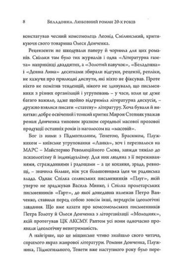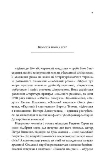 У черговій антології проекту "Наші двадцяті" зібрано зразки любовного роману 20-х років – літератури, яку називали порнографічною, сороміцькою, тілесною, літератури, яка, проте, дає зрозуміти, про що думали, як думали і що думали про почуття, родину, кохання і міжстатеві конфлікти у той час. Зібрані тексти ілюструють тезу, що двадцяті – час не лише "серйозної" високочолості, покликаної служити музам, а й цілком якісної, цікаво зробленої масовості.