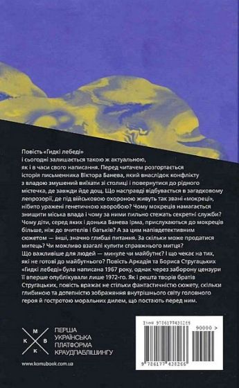 Повість «Гидкі лебеді» і сьогодні залишається такою ж актуальною, як і в часи свого написання. Перед читачем розгортається історія письменника Віктора Банева, який внаслідок конфлікту з владою змушений виїхати зі столиці і повернутися до рідного містечка, де завжди йде дощ. Що насправді відбувається в загадковому лепрозорії, де під військовою охороною живуть так звані «мокреці», нібито уражені генетичною хворобою? Чому мокреців намагається знищити міська влада і чому за ними пильно стежать секретні служби? Чому діти, серед яких і донька Банева Ірма, прислухаються до мокреців більше, ніж до вчителів і батьків? А за цим напівдетективним сюжетом — інші, значно глибші питання. За скільки може продатися митець? Чи можливо взагалі купити справжнього митця? Що важливіше для людей — минуле чи майбутнє? І що чекає на тих, які не готові до майбутнього? Повість Аркадія та Бориса Стругацьких «Гидкі лебеді» була написана 1967 року, однак через заборону цензури її вперше опублікували лише 1972-го.