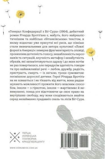 «Генерал Конфедерації з Біґ-Сура» (1964), дебютний роман Річарда Бротіґана є, мабуть, його найреалістичнішим та найбільш «бітниківським» текстом, в якому водночас уже присутні всі риси, що пізніше стали визначальними для автора культової «Ловлі форелі в Америці»: химерна фрагментарність оповіді, пронизлива дотепність голосу, нешаблонність персонажів та ситуацій, влучність метафор і незабутність образів, які запам’ятовуються одразу і до яких потім не раз повертаєшся, але передусім здатність говорити про найважливіші речі любов, дружбу, радість, пристрасть, смерть із легкою, трохи сумовитою посмішкою дорослої дитини. Герої Річарда Бротіґана не ховаються і не тікають від життя, вони радше шукають можливості прожити його власним способом, інколи з гіркотою, інколи жартівливо й невимушено, понад усе відстоюючи це своє право на внутрішню свободу, яку вони сподіваються знайти серед незайманих прадавніх скель та лісів Біґ-Сура.
