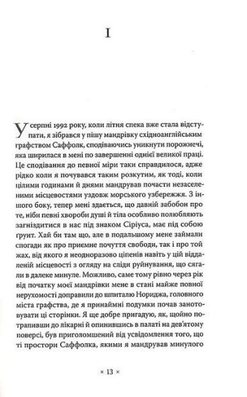 Зовнішній, сюжетний контур роману творить фіктивна подорож головного протагоніста східно-англійським графством Саффолк, яка окремими широкими мазками відтворює історію цього регіону, однак, як завжди у Зебальда, ця історія постає перед читачем не як абстрактна, безособова історія великих наративів та визначних дат, а як сукупність локальних, особистих, «банальних» історій окремих людей, будинків, місцевостей, творів мистецтва і епох.