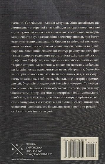 Сьогодні багато критиків називають В. Ґ. Зебальда одним із найвизначніших та найталановитіших німецькомовних романістів кінця ХХ — поч. ХХІ століття. Його роман «Кільця Сатурна. Одне англійське паломництво», вперше опублікований у 1995 році, створений у типовій для автора манері, яка поєднує художній вимисел із вдумливою історико-культурологічною й філософською есеїстикою, витворюючи неповторну, надзвичайно поетичну оповідь про багатство культурних ландшафтів Європи та світу, які тисячами ниток вплітаються в долю окремих людей, регіонів та цілих народів.