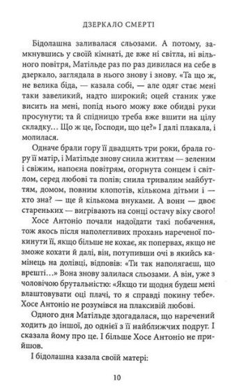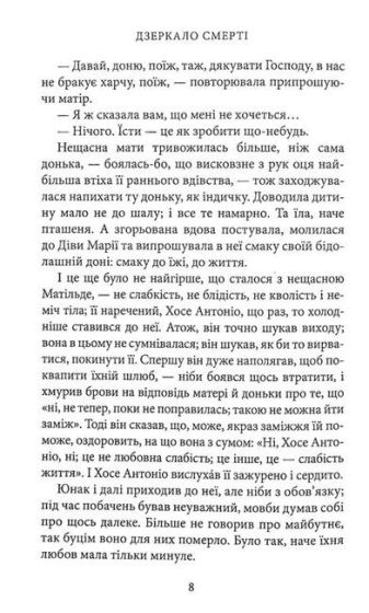 «Дзеркало смерті» — це 27 коротких історій, які були публіковані впродовж двох десятиліть у різних газетах і журналах і які Міґель де Унамуно сам підготував до видання під однією обкладинкою 1913 року. Одні мовби продовжують, розширюють і доповнюють сюжетні лінії, філософські міркування та психологічні портрети з інших текстових полотен письменника, другі ж дивують несподіваною тематикою чи кутом зору. Це історії про життя і смерть, відображені одне в одному, а отже — про дійсність і потойбіччя, сентиментальність і іронію, про дітей і тих, хто на схилі віку, про любов у її різних проявах. Але є тут і розмірковування інтелектуала про політику, про суспільство і врешті про таїнство творчості. Це чи не найцікавіший путівник по неповторних oбразах та ідеях великого іспанського письменника і філософа.