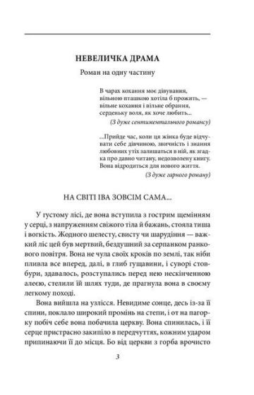 Роман «Невеличка драма» — це історія нещасливого кохання Марти Висоцької та Юрія Славенка. Красива, молода, сповнена сил і мрій, Марта має роботу й власне житло. Проте їй самотньою в місті, яке нещадно її переслідує, вона живе мріями про того єдиного принца, як у романах. До неї навідується багато чоловіків, які прагнуть мати її за дружину або коханку. Однак ні з ким із них Марта не погоджується на взаємини. І ось у це спокійне розмірене життя вривається нове почуття — пристрасть, яке Марта плутає з коханням.