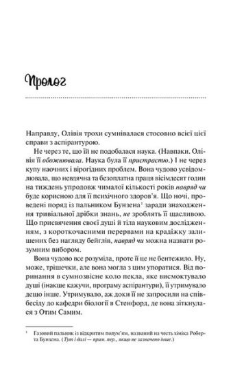 Олівія Сміт — біологиня, яка мріє не про романтичні стосунки, а про докторський ступінь. Але що робити, коли найліпша подруга не дає тобі спокою з отим коханням ні вдень, ні вночі? Звісно ж, знайти хлопця, який вдаватиме любчика. На цю роль годиться не абихто, а молодий і гарячий професор Карлсен: м-м-м, біологія, Стендфорд, поцілунки... Непоганий початок, погодьтеся! Олівія має чіткий план і не чекає від славного на всю кафедру Адама «Гедзя» Карлсена розуміння чи підтримки. Але після інциденту на великій науковій конференції Адам стає на її бік. І раптом дівчина помічає, що ї ї обранець не лише розумний, але й чуйний і врівноважений хлопець… із кубиками пресу (о боги!). Щойно маленький експеримент виходить з-під контролю, а теорія романтики розбивається на друзки, як Олівія розуміє: дослідження власного серця під мікроскопом буде складнішим за гіпотезу кохання!