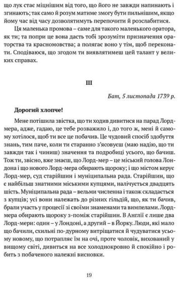 Листування британського державного діяча, дипломата, письменника та філософа-мораліста Філіпа Дормера Стенгоупа, 4-го графа Честерфілда (1694–1773) з його позашлюбним сином – одна з найславетніших пам'яток європейської епістолярної прози XVIII століття. Спираючись на власний життєвий досвід, Честерфілд ділиться зі своїм нащадком порадами, які мали б допомогти тому досягти впливового становища та успіху у вищому світі. Більшість листів є справжніми уроками, що охоплюють широке розмаїття тем від античної міфології до секретів поводження у товаристві – з чоловіками та жінками, з друзями та недругами. Сучасний читач теж може знайти у цих листах чимало корисних рекомендацій, зокрема, щодо вивчення іноземних мов, планування справ та мудрого використання дарованого нам часу.