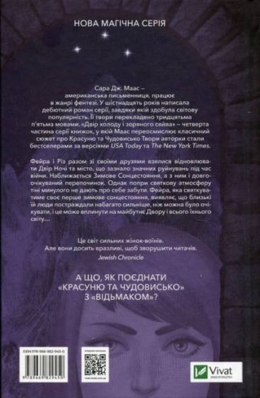 Про авторку:Сара Дж. Маас – американська письменниця, працює в жанрі фентезі. У шістнадцять років написала дебютний роман серії, завдяки якій здобула світову популярність. Її твори перекладено тридцятьма п’ятьма мовами. «Двір холоду і зоряного сяйва» - четверта частина серії книжок, у якій Маас переосмислює класичний сюжет про Красуню та Чудовисько. Твори авторки стали бестселерами за версіями USA Today та The New York Times.