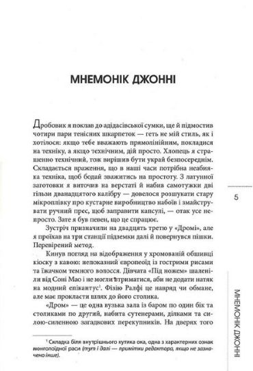 Глобальна мережа Інтернет, що ось-ось перетвориться на той самий Кіберпростір, високотехнологічні комунікації, в лабіринтах яких точаться інформаційні війни, інформація як найбільша цінність і водночас найпотужніша зброя новітнього часу, віртуальна реальність, явні й приховані війни корпорацій за панування над новітніми технологіями, а отже, і над світом, модифіковані людські тіла і свідомості нового рівня, штучні інтелекти й етичні питання, пов’язані з їхнім існуванням, – ми вже майже вступили в колись описаний Ґібсоном світ, тож корисно зазирнути ще трохи далі й дізнатися, що чекає на людство за найближчим поворотом його історії. Саме таку можливість і дає нам ця непересічна класика кіберпанку.