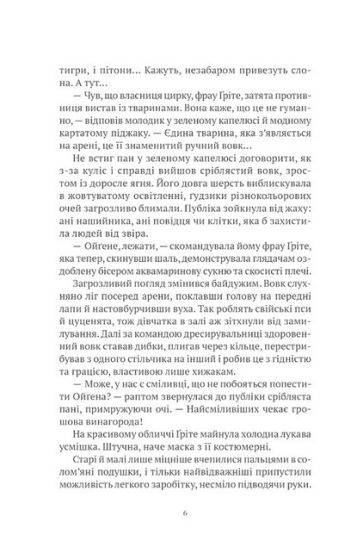 Ефектна власниця мандрівного цирку фрау Ґріте переживає скрутні часи. Мало того, що її чоловік виявився авантюристом і зник безвісти, так ще й трупу доводиться від зубожіння рятувати. До всього, коронний номер — виступ велетенського ручного вовка — на межі провалу: юна глядачка, яку всі вважають причинною, сходить на сцену й приборкує грізного звіра. Що це, як не відьмацькі чари? Цирк рушає далі. Але з тої зустрічі в смугастому шатрі, на один вечір напнутому посеред скошеного поля, бере початок нова історія: про тих, хто шукає любові й справедливості, про людей і перевертнів, що намагаються віднайти свою істинну сутність.