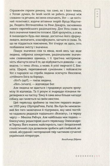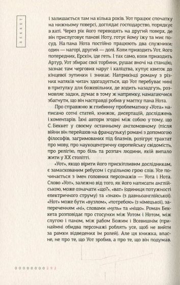 У цьому творі, як і в інших своїх романах та п’єсах, Беккет з допомогою філософів, загримованих під блазнів, розігрує трактат про мову, наукоцентричну європейську свідомість, про релігію, про біль і розпач людини, якій випало жити у ХХ столітті. Попри глибину порушених у романі тем і проблем, «Уот» є, мабуть, найприступнішим, найдотепнішим та найабсурднішим твором великого ірландця, лауреата Нобелівської премії з літератури (1969).