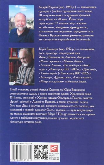 Подіі? у новому романі Андрія Куркова та Юрія Винничука розгортаються одразу в трьох сюжетних зрізах: Хрестовий похід 1111 року, описаний у Хроніці лицаря Ольгерда з Галича, початок Другоі? світовоі? у Львові та Кракові, а також сучаснии? період. Хто така Діва, і чому на неі? полюють декілька століть поспіль, ким насправді є чорнии? археолог Олег, і головне – куди ведуть двері, які можна відчинити ключами Маріі?? Про це дізнаєтеся зі сторінок одного з наи?більш очікуваних романів сучасноі? украі?нськоі? літератури останніх років.