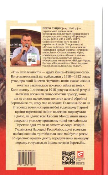 «Тінь незалежності» — друга книга «Галицької саги». Вона охоплює події, що відбувалися у 1918-1922 роках, у час, про який Вінстон Черчілль потім скаже: «Війна велетнів закінчилася, почалася війна пігмеїв». Коли зранку 1 листопада 1918 року на міській ратуші львів'яні побачили синьо-жовтий прапор, вони ще не знали, що це лише початок довгої збройної боротьби за ті, кому має належати Галичина. Коли на її теренах точилися криваві бої, у далекому Парижі країни-переможці «війни велетнів» вирішували її долю, як і долю всієї Європи. Молох війни знову закружив у своєму кривавому танці селян Перетин: одні стали на захист молодої Західноукраїнської Народної Республіки, другі воювали на боці поляків, треті бачили своє майбутнє разом з Червоною армією; дехто, передчуваючи неминучу поразку, готувався до інших методів боротьби...