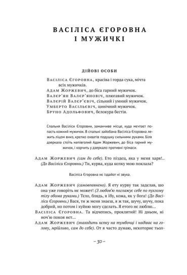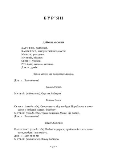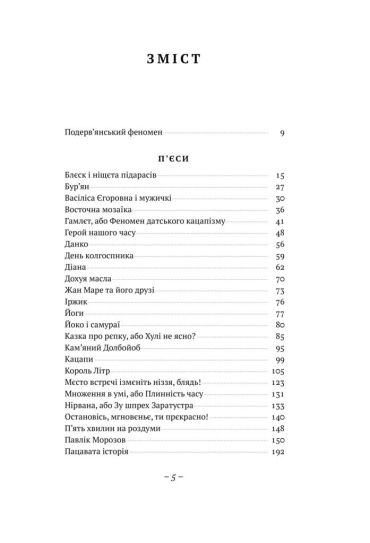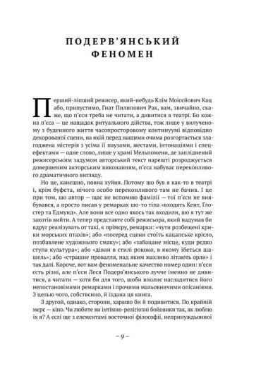Када Лесь Подерв’янський переступав через бездиханне тіло великої Літератури, вона вдруг ожила; після того в них сталася преступна связь, і не одна. Про наслідки ніхто не думав. Герої і мутанти, історичні персонажі і класична нечисть, майстерні богошукачі й не менш пікантні бляді -над ними всіма ширяють ангели злословія, ковтають шпаги і безстижо блюють на солов’їв. Творчість Подерв’янського - се викоханий плід художньої поножовщини та халатної медицини. У його п’єсах підступний естетизм вискакує з кущів - пальто нарозхрист - і показує читачам геть усе: і Ніцше, і кацапів, і гімно.