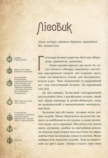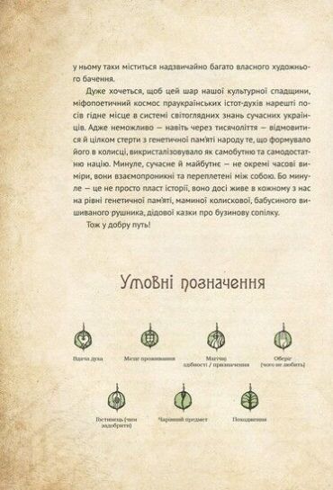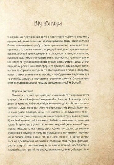 Ця книга - чарівна. Ви не просто полистаете її сторінки - ви погуляйте стежками правічного лісу, почуєте його дихання, подивіться в очі старенькому дідька, послухаєте звуки сопілки. Може, вам щось прошепоче німфа або поговорить з вами шановний цар Ох ... Ви постоїте біля річки - застанете русалок за їхніми витівками, а звідти недалеко і в гості до суворих болотяника і болотяници. А далі - прогулянка полем і луками, де вас зустрінуть і лісовики, і спориш, і щучник ... та й вітри з повитрули будуть супроводжувати вас під час подорожі. І наостанок свої таємниці відкриють парфуми часів року. Перед вами постане величезний і дуже цікавий шар культурної спадщини давніх українців, химерний світ чарівних істот праукраїнської міфології, досліджено і опрацьований Дарой Корній.