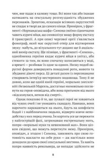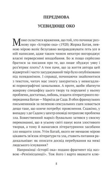 «Історія ока» (1928) Жоржа Батая розповідає про еротичні пригоди двох молодих людей, оповідача та Симони, юнки, яка «так відчайдушно прагне всього, що засмучує, що найменш помітний заклик почуттів несподівано надає її обличчю рис, які прямо вказують на все, пов’язане з глибинною сексуальністю — до прикладу, кров, задуху, раптовий жах, злочин, усе, що назавжди руйнує людське блаженство та чесність». Симона та її приятель-оповідач залучають до своїх химерних ігор третю героїню – Марсель, побожну дівчину, яка, збожеволівши під час оргії, потрапляє до клініки, звідки парочка, одержима її вродою, витягає її. Продовження розпусти переносить оргіастичних Бонні і Клайда до Іспанії, де пригоди розгортаються спочатку на мадридській арені для биків, а потім «під сонцем Севільї» — сонцем одночасно ментальним і космічним, чорним і сліпучим, яким одержимий Батай.