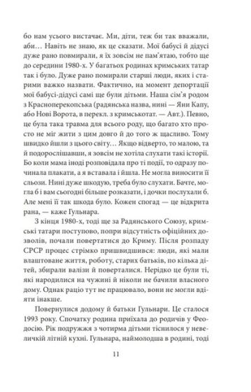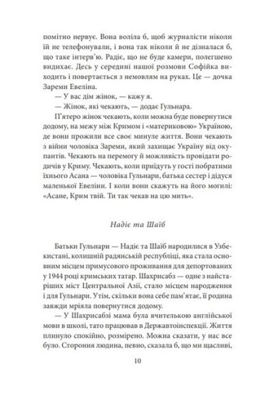 Цю книжку склали чотирнадцять історій кримськотатарських родин, які розповіли авторці різні люди, відомі й невідомі. У них спільний біль і спільна пам?ять про жахіття війни, гоніння, депортації, голод. З покоління в покоління їх переслідує один і той самий ворог, яку б нову назву він щораз для себе не придумував: чи то російська імперія, чи то срср, чи то російська федерація. Тортури, до яких він вдається, мають приборкати кримських татар, а в разі непокори нелюди просто знищують і так нечисленний народ. Ніби наяву читач побачить змучених підлітків, які збирають бавовну в Голодному степу Узбекистану. Розпач жінки, яку виганяють з рідної домівки. Горе дружини загиблого захисника України. Та об?єднані ці родини не тільки спільним болем, а й спільним прагненням: повернути собі Батьківщину, жити у вільному Криму.