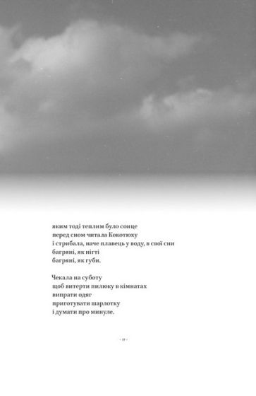 Як курява ковтає будинки. Як рвуться сталеві нитки снарядів. Як стираються вулиці, наче коректором. Як пострибунчик сонця падає додолу. Як вигинається трава після того, як по ній пройшла група піхотинців. Як дідусь тягне велосипед і зникає в тумані. Мусимо побачити дерева і гори, сніги і ріки, любов. І дихати, бо це сьогодні розкіш.