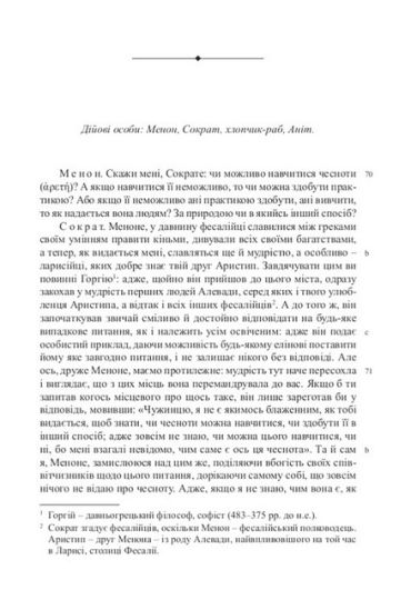 Видання містить два твори Платона, одного з найвизначніших філософів в історії людства. Це «Кратил, або про імена» – сократичний діалог, у якому з’ясовується, чи допомагає знання про іменування речей пізнанню їхньої сутності; а також діалог «Менон, або про доброчесність», котрий говорить про знання як пригадування і в якому вперше можна побачити головні риси ідеалістичної доктрини Платона.