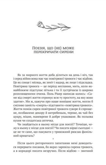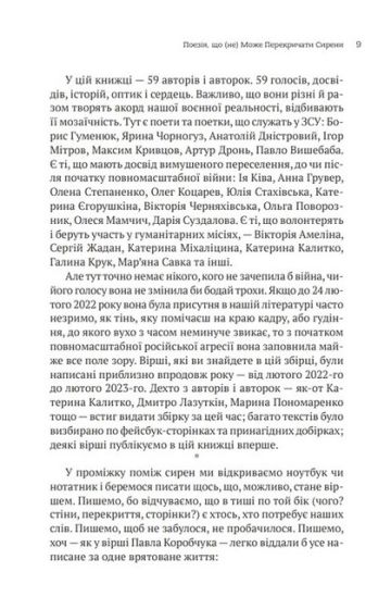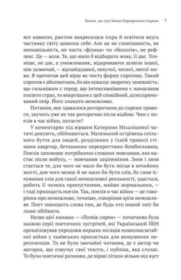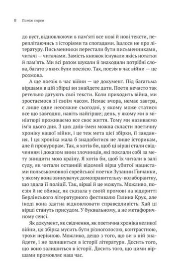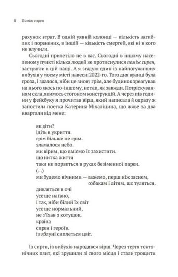 Поетична антологія «Поміж сирен» — свідчення великої війни, що мала нас знищити й обнулити українську культуру. Але всупереч усьому ми вистояли, а наша поезія звучить надпотужно і щиро, єрихонськими трубами руйнує мури, якими обгороджено душі, сягає сердець. Відкритих. Зболених. Чутливих. Сердець, які поміж сирен вчаться жити далі.