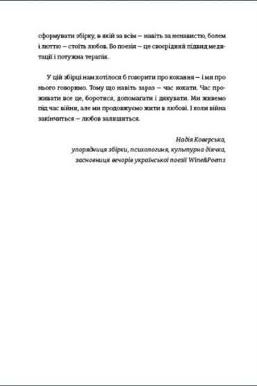 «Книга Love 2.0. Любов і війна» — це розмаїття щемких історій, художніх образів та поетичних рефлексій, які вплітаються у спільну канву проживання війни. Ці вірші вміщують у собі цілий спектр емоцій і почуттів: кохання і ненависть, пристрасть і лють, ніжність доторків і смуток від розлуки, віру в любов і біль від утрати. Це поезія про темряву, що накриває з приходом ворога, і про світло, яке мусить перемогти. У книжці зібрано 89 творів. Серед них — поезії сучасних авторів, написані під досвідом нинішньої російсько-української війни, та вірші класиків, які, створені українськими митцями ще в попередні століття, зараз набувають нових сенсів і прочитань. Частина авторів збірки служить у ЗСУ, деякі з них перебувають на фронті — і продовжують писати, фіксуючи те, якою є любов у воєнний час. Збірка «Книга Love 2.0. Любов і війна» створена зокрема у знак подяки ЗСУ та всім, хто працює на перемогу, а також у пам’ять про тих, хто віддав своє життя на захист України.
