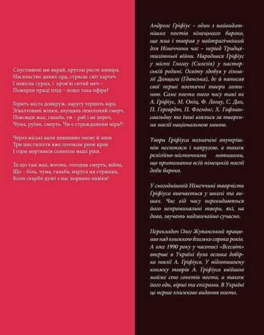 Андреас Ґріфіус – один з найвидатніших поетів німецького бароко, що жив і творив у найтрагічніший для Німеччини час – період Тридцятилітньої війни. Народився Ґріфіус у місті Ґлогау (Силезія) у пасторській родині. Освіту здобув у гімназії Данциґа (Ґданська), де й написав свої перші поетичні твори латиною.