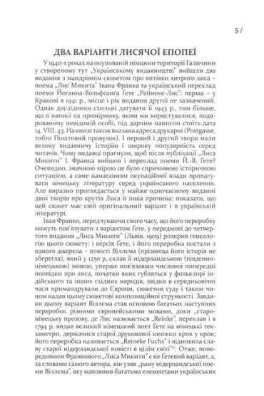 Перевидання „під одним дахом” українського перекладу поеми Йоганна-Вольфґанґа Ґете „Райнеке-Лис” та поеми Івана Франка „Лис Микита” знайомить читачів з двома варіантами сюжету, поширеного серед багатьох народів світу, про авантюрні витівки хитрого лиса. У творах німецького та українського поетів, які мають спільне джерело, відчитуються сатиричні інтонації. Попри подібність багатьох ситуацій обидва твори мають виразні ознаки національної і авторської своєрідності. Текст перекладу поеми Й.-В. Ґете публікується за львівським виданням 1943 р., поеми І. Франка – за зібранням творів письменника у 50-ти томах (К., 1976, т. 4). Переклад поеми Й.-В. Ґете „Райнеке-Лис” публікується за примірником, який належить родині Тетяни та Андрія Воробкевичів, за що упорядник висловнює їм щиру вдячність.