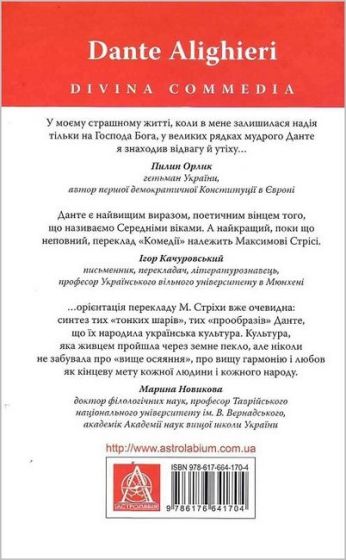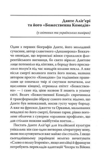 Водночас ця книга має стати для сучасного читача справжнім путівником у світ великого Данте. Вона містить докладну передмову, присвячену життю й творчості італійського поета, а також — впливу «Божественної Комедії» на розвиток української літератури. А додана до перекладу антологія пов’язаних із постаттю Данте українських віршів, написаних упродовж останніх понад півтораста років, наочно демонструє, що Україна булла і є частиною культурної Європи.