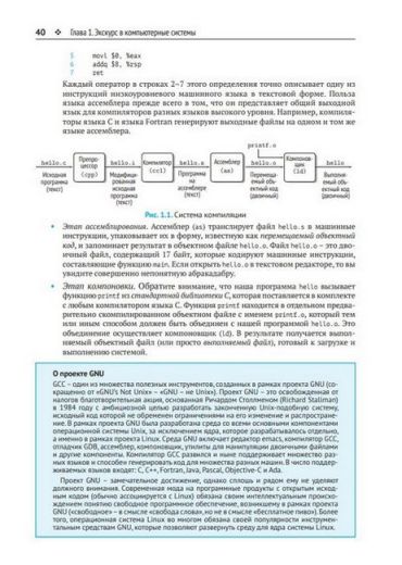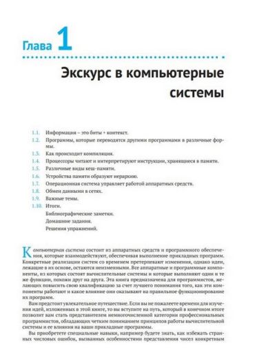 В книге описываются стандартные элементы архитектуры, такие как центральный процессор, память, порты ввода-вывода, а также операционная система, компилятор, компоновщик и сетевое окружение. Демонстрируются способы представления данных и программ на машинном уровне, приемы оптимизации программ, особенности управления потоками выполнения и виртуальной памятью, а также методы сетевого и параллельного программирования.