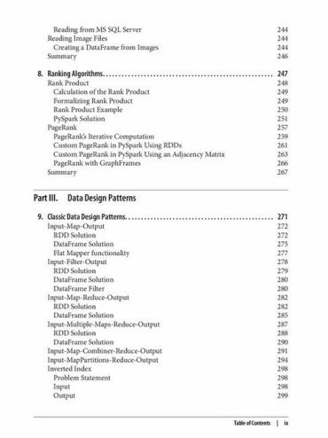 In each chapter, author Mahmoud Parsian shows you how to solve a data problem with a set of Spark transformations and algorithms. You'll learn how to tackle problems involving ETL, design patterns, machine learning algorithms, data partitioning, and genomics analysis. Each detailed recipe includes PySpark algorithms using the PySpark driver and shell script.
