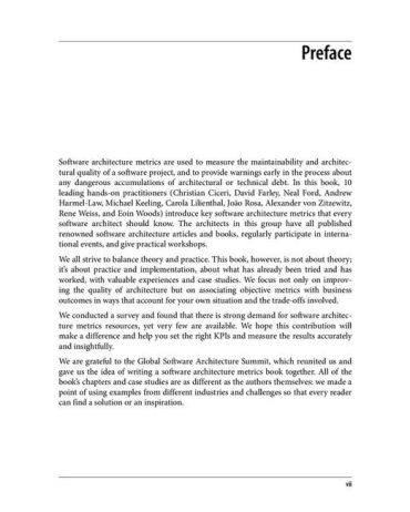 Software architecture metrics are key to the maintainability and architectural quality of a software project and they can warn you about dangerous accumulations of architectural and technical debt early in the process. In this practical book, leading hands-on software architects share case studies to introduce metrics that every software architect should know.