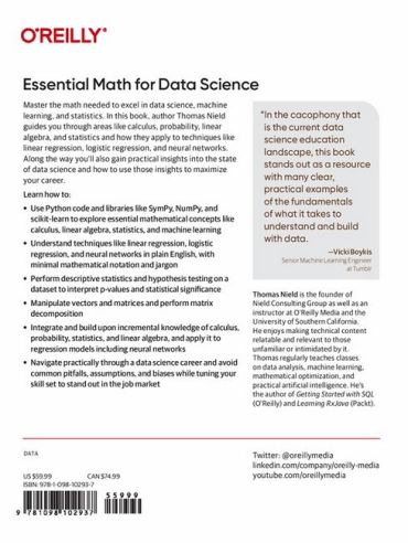 Master the math needed to excel in data science, machine learning, and statistics. In this book author Thomas Nield guides you through areas like calculus, probability, linear algebra, and statistics and how they apply to techniques like linear regression, logistic regression, and neural networks. Along the way you'll also gain practical insights into the state of data science and how to use those insights to maximize your career.